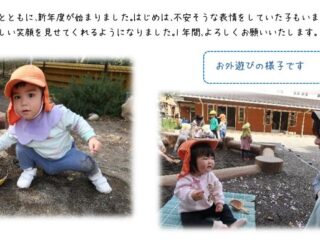 園庭、そして奥に続く山の斜面にも登ることができ、全身を使いながら自然の中でおままごと、キャンプごっこ等、遊びが広がります。