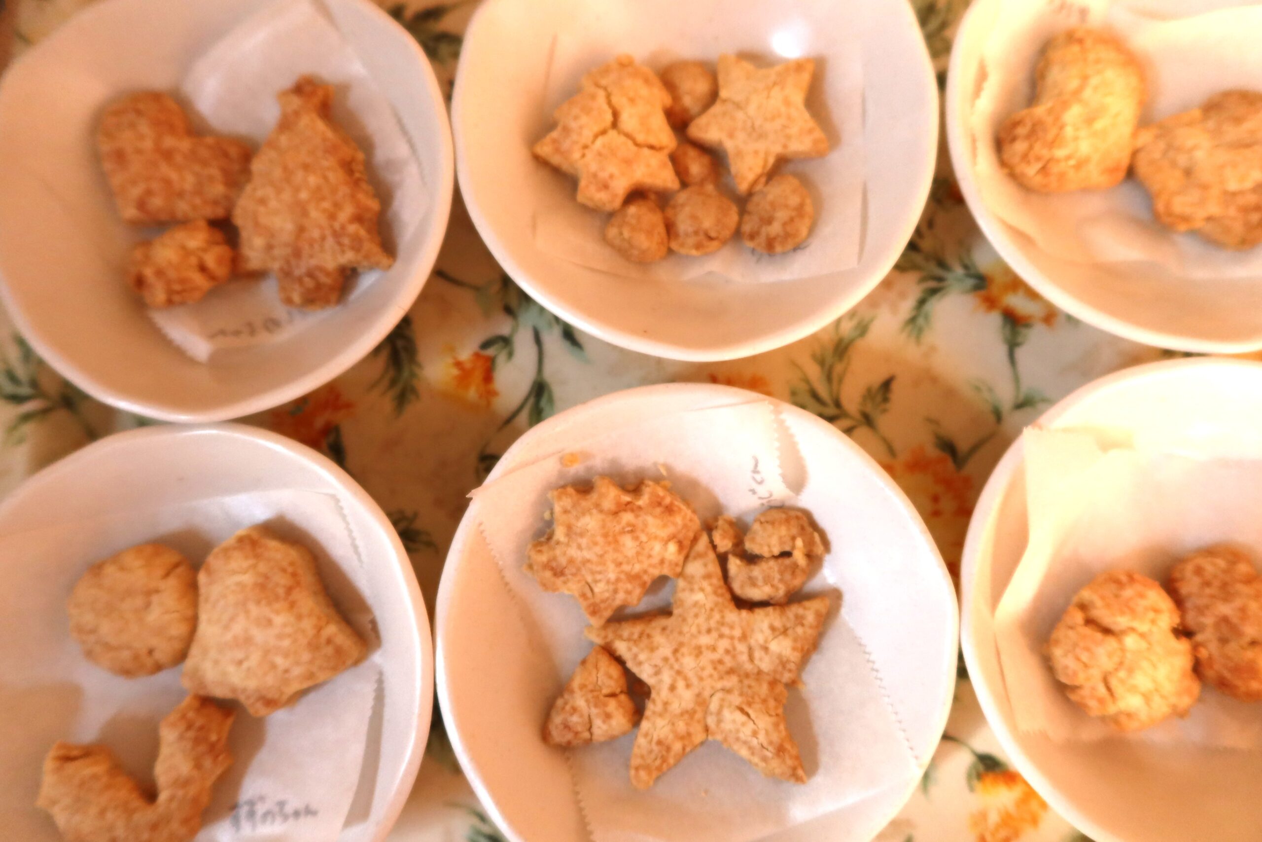 その後は、クッキー作り。サンタさん・トナカイさん・お星様などの型抜きクッキーを作りました。お母さんと一緒に生地をのばして型抜きしたクッキーを整えて、可愛いクッキーのできあがり!とても美味しかったです。