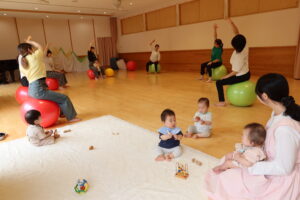 5/23㈮ 子育て支援のイベントで〝産後ケアとバランスボール〟を行いました。 0歳のお友達とお母さん…